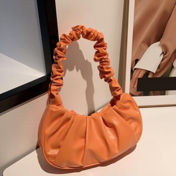 Stylish orange bag with a unique ruched handle. Perfect for adding a pop of color to any outfit.
