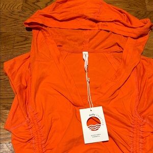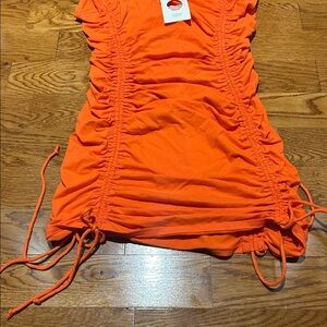 Stylish orange mini dress with ruched detailing. Perfect for a night out.