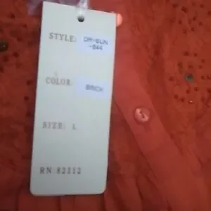 Bright orange sleeveless dress with button-front closure. Features tonal horizontal trim and ruffle hem. Lightweight, breezy silhouette. Tag visible at neckline.