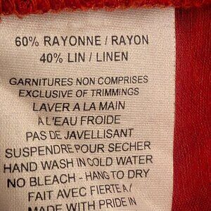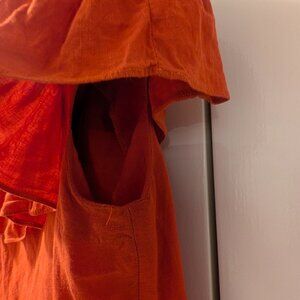 Vibrant orange Jennifer Glasgow top, made in Montreal, Canada. It's a size large, but not an overly generous one. I would say if you're a large it runs true to size, but would be tight for someone who runs more L/XL. The fabric does tend to wrinkle and feels linen-y. The ruffle skims nicely over the shoulders to the underarm. The underarms have a tiny bit of wear, but no obvious fading. It's a really nice pop of colour for the spring/summer! ☀️