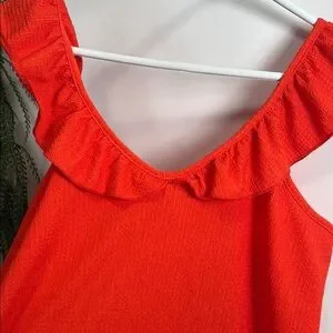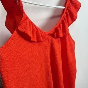 This mini sundress showcases a sleeveless design with a flattering V-neckline and playful ruffled accents. Ideal for summer and its vibrant orange hues make a bold statement. The lightweight fabric ensures comfort and style for any special occasion. Can be worn casual as well or as a long top. Great summer fun.