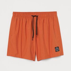Swim shorts in woven fabric. Elasticized waistband with drawstring, side pockets, and back pocket with hook-loop fastener. Mesh liner shorts.