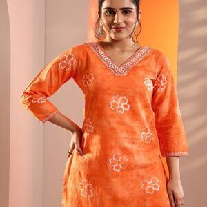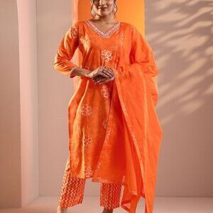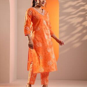 Elevate your ethnic wardrobe with this Orange & White Printed Kurta Set with Trousers & Dupatta. Crafted from a soft cotton blend, the straight kurta features a V-neck, long sleeves, and calf-length hem for a flattering fit. The printed trousers with partially elasticated waistband and slip-on closure perfectly complement the kurta, while the solid dupatta with border completes the elegant 3-piece set. Available in S–2XL, this ensemble blends comfort, style, and traditional charm—perfect for festivals, casual outings, or daily wear.