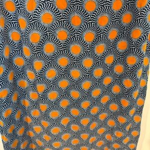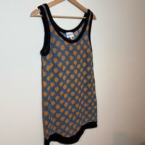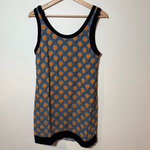 Stylish orange and black patterned tank top perfect for casual outings. Comfortable and trendy design.