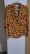 Stylish orange blouse with bold blue and white leopard print. Features a draped neckline and front pockets. Perfect for a chic look.