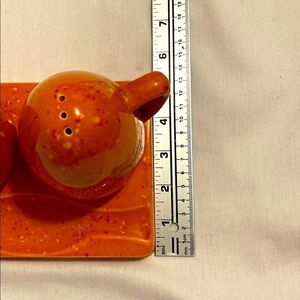 Orange speckled salt and pepper shakers with the tray vintage kitschy 70s BoHo
