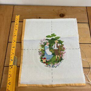 Completed cross stitch design "Orchard Rendezvous" made from Creative Circle Kit #1934. Can be framed or finished as desired. Design size is approx. 6 1/4" x 4 1/2", fabric size is approx. 9 1/2" x 11 3/4". Pre-owned hand made condition: fabric still has grid-lines stitched across center line (can be easily removed). Fabric has tape along two sides as shown; untaped side is fraying.