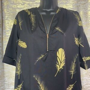 - Gorgeous black/green leafy print Roll-Up sleeve blouse .v-neck detailed with gold zipper.soft and comfy to wear