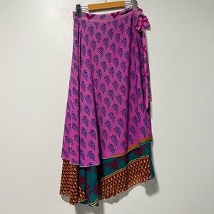 Add a vibrant and free-spirited flair to your wardrobe with this stunning wrap skirt by Orient Emporium. Crafted from 100% rayon, this lightweight and breathable skirt features a mix of bold pink and teal hues with intricate floral and geometric prints. The adjustable wrap style ensures a comfortable and customizable fit, perfect for casual outings, summer vacations, or bohemian-inspired ensembles.