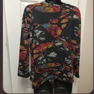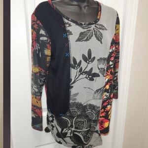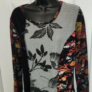 🌿 Orientique Australian asymmetrical top. Rayon polyester blend, multi-pattern tunic top, long sleeves, artistic floral designs, scoop neckline.