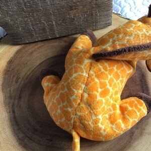 Twigs is a bright yellow giraffe covered in an orange “giraffe print” pattern. He has black button eyes and brown hooves. He has two tiny horns on top of his head.