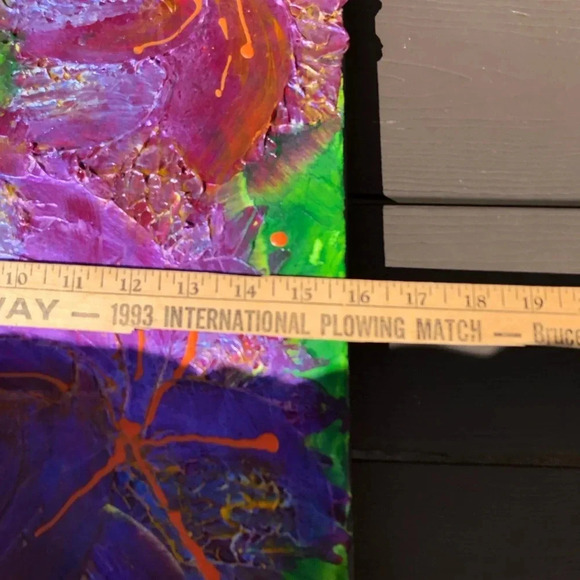 Vibrant purple/pink flowers with a lime green background. Signed by the artist. I believe this was done in oil paint and it is on canvas.