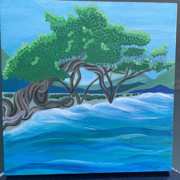 This vibrant painting by M. dela Cruz captures the strength and grace of coastal life through a striking depiction of a tree rooted at the ocean’s edge. Its twisted, flowing trunks rise from swirling blue waves, reaching into a lush canopy of dotted green foliage. The background of serene mountains and sky adds depth and calm, balancing the energy of the water below. The piece evokes a sense of resilience, connection, and harmony between land and sea. 9.5" x 9.5"