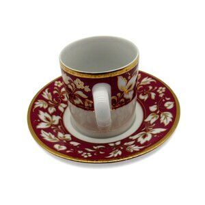 This elegant demitasse Espresso coffee cup and saucer set showcases intricate gold floral patterns on a vibrant red background.