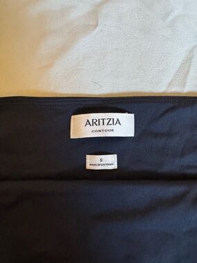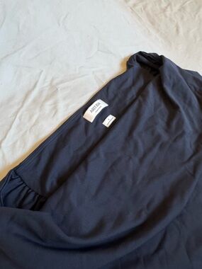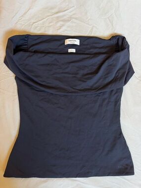 Asymmetric one-shoulder design with a twisted strap. Smooth, fitted knit fabric. Deep charcoal hue for a polished look.