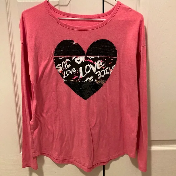 Flip sequence pink long sleeve shirt that has a heart that says love