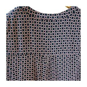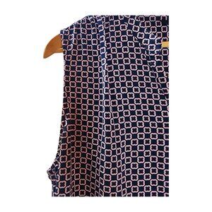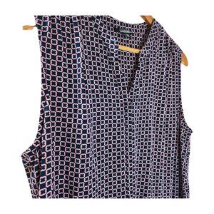 This pre-loved Nicole Miller blouse is a classic addition to any wardrobe. The sleeveless design and V-neckline make it perfect for any occasion, whether it's casual, business, or travel. The black and pink geometric pattern adds a touch of color to the basic style. Made from rayon, this blouse is comfortable and breathable, making it perfect for the summer and spring seasons. The pullover closure and longer fit make it easy to wear and stylish.