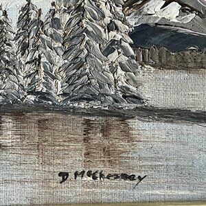 Signed by the artist D. McChesney, it features a muted palette of whites, greys, and soft blues, evoking a quiet, tranquil atmosphere.