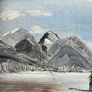 This oil painting captures a serene winter landscape with snow-covered trees and a mountainous backdrop.