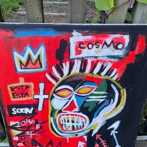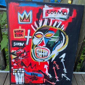 This expressive painting channels a raw, street-art energy reminiscent of Jean-Michel Basquiat. The central figure—a distorted, mask-like face—features exaggerated eyes and clenched teeth, set against a frenetic backdrop of vibrant yellows, whites, and abstract markings. The hair explodes outward in jagged white strokes, evoking a crown or mental storm. This piece exudes emotion, chaos, and commentary on identity, society, or inner turmoil. The graffiti-style text, asymmetry, and high contrast colors deliver a powerful urban and neo-expressionist aesthetic.