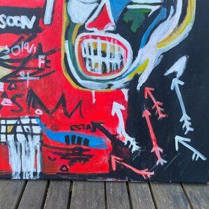 This painting is a vivid, chaotic composition in a neo-expressionist and street art style, heavily inspired by Jean-Michel Basquiat. The central focus is a stylized, mask-like face with exaggerated features—white teeth, colorful eyes, and radiating white spikes that evoke a crown or headdress. The background is a bold red field partially bordered with black, filled with graffiti-like text, arrows, scribbles, and symbols.