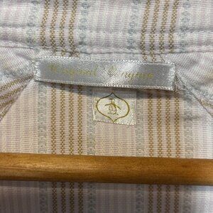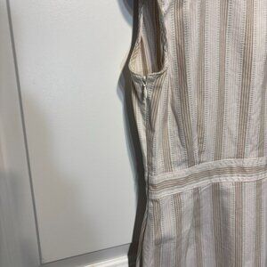 Excellent condition Original Penguin striped sleeveless dress. False pleat in the front to add movement. Cotton stretch blend for comfort. Blue/tan/cream stripes for a classic preppy look. Side zip closure.