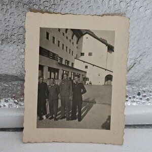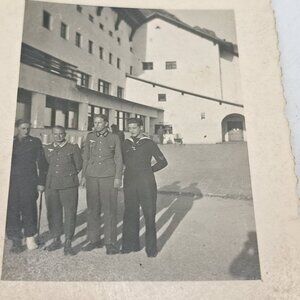 An original photo of 4 German serviceman, the one on the photo's left a Kriegsmarine sailor. The other 3 look to be Wehrmacht soldiers and possibly a Luftwaffe man. The man on the photo's right has a bandaged foot and a crutch or cane so the 4 are probably on convalescence leave. The picture is 2 1/4" wide by 2 7/8" in height.