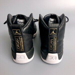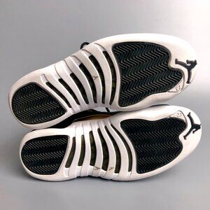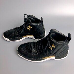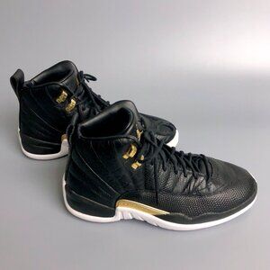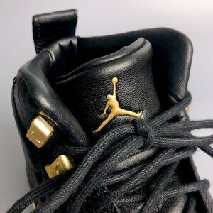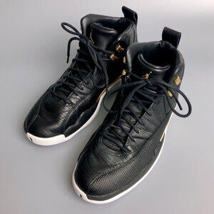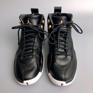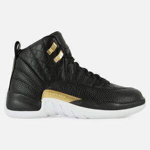 The Wmns Air Jordan 12 Retro 'Reptile' sneaker draws details from the 1996 classic and elevates them with luxe style additions. This April 2019-released, women's-exclusive shoe features the AJ12’s original stitching, inspired by the Rising Sun Flag of Japan. Its black leather upper is laden with exotic reptile-inspired texture and embellished with gold accents. This edition is completed with classic Zoom cushioning and sections of herringbone tread.