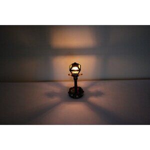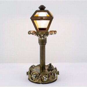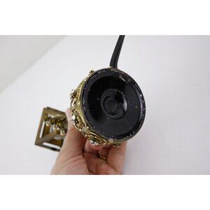 This precious little night light or vanity light has been jewelry encrusted with faux pearls and glitzy clear paste stones. It has a gold gilt finish, I have not polished it. The top with a small pear shaped light bulb in a hinged cage construct. There is a light switch to the foot. It has been labelled 'Original by Robert' on the other side of the foot. The electrical chord - a replacement - is black and slightly stiff with a US outlet plug. The light works well and shines bright. The little light switch works well too. Overall this little collectible item is in great condition, especially considering it dates from around 1940-1950s. I have found one embellishment that looks to be missing a couple little pearls.