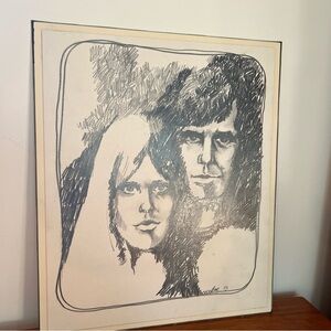 Original portrait, pencil M Keller 1973 drawing on board Mcm retro vintage