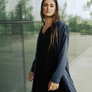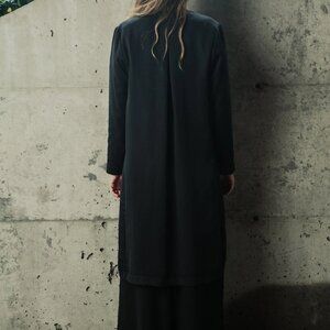 Long knee length jacket with pockets. Loose fit, long sleeves and worn open. With two pockets on each side and a pleat at the back.