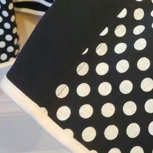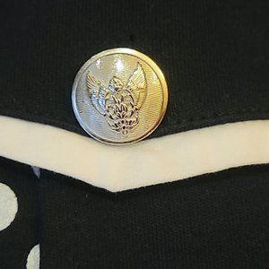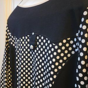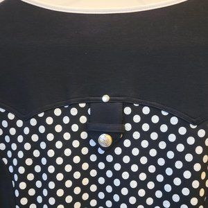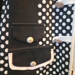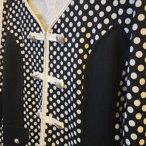 Orly, EUC,Size M, 100% cotton navy and white polka dot full zip jacket, with beautiful silver embossed button details, 3 non-finctioning pocket details.