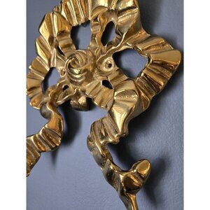 A fabulous vintage solid brass wreath hook in the shape of a ribbon bow. Circa 1980s, from the Bombay company. The styling of the bow with scroll like waves has a very Victorian or French Provincial feel. This piece is a wonderful seasonal decor accessory for a wreath or Christmas stocking, or it could make a dramatic statement for year round styling in a maximalist space!