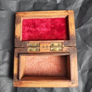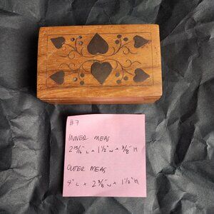 Antique vintage solid wood box with cute brass inlay heart design on top. The top does not sit flush with bottom. Could use some TLC. Many more boxes posted.
