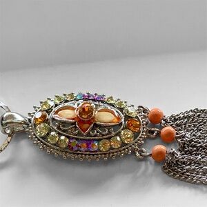 Large oval pendant features art glass centre rimmed with yellow, amber and aurora borealis crystal beads and 3 tassels with orange beads. Set in silver tone metal.