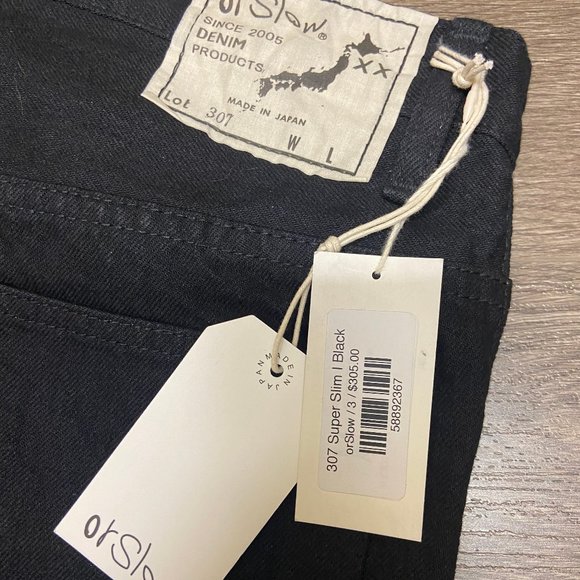 This is the slimmest jean from orSlow, narrower than the 107s with a regular rise and a very slim leg. Cut from a black denim that has been washed once for a slightly broken-in feel.