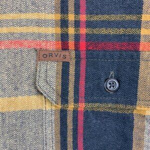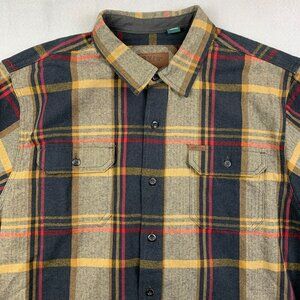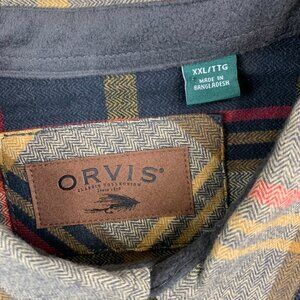 Orvis Mens Shirt Jacket 2XL Brown Black Plaid Flannel Button Up Heavyweight
