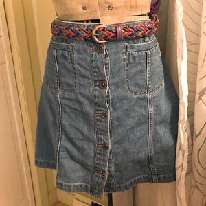 Beautifully woven belt with tan, dark brown, blue & red cords.