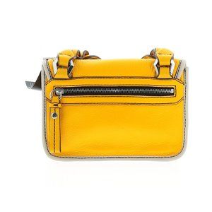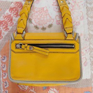 A stunning, one-of-a-kind leather crossbody purse from designer brand Oryany. Features geometrical hardware (and bolts) in silver, braided leather details, 2 interior pockets (one with a zipper) and one exterior zipped pocket. Magnetic closure. The color has rubbed off a bit where the magnet is (see 5th and 6th pictures), but it's on the inside so it's not noticeable. There was also a loose grommet that has been reinstalled then reinforced with super strong glue and a stitch point, see last picture.