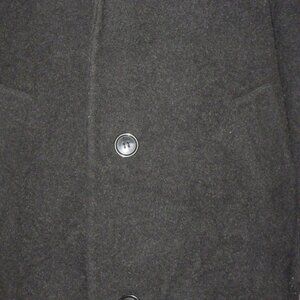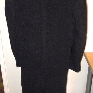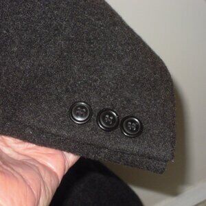 please note that my dress form is a woman's small so coat is not hanging properly. Color is a dark gray (almost black). Made of 70% wool, 20% nylon and 10% cashmere. Size is Men's 38. It is fully line with several pockets in the lining. Two outside side slashed pockets. Three buttons down the front and 3 buttons at the cuffs. Condition is excellent. Please use my measurements against a coat you already own to ensure it will fit.