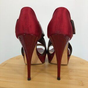 Oscar De La Renta Red Satin Brown patent leather buckle Platform Stilettos 37