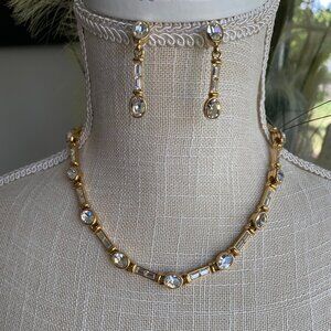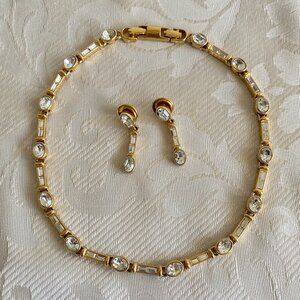 Vintage Circa Late 1980's -early 1990 Oscar De La Renta Gold Tone Crystal Necklace & Drop Earrings Set. Make an Unforgettable entrance with this stunning two-piece designer set by Oscar De La Renta. Featuring alternating oval and baguette cut clear faceted crystals each bezel set in rich gold tone metal that captures timeless elegance with a hint of vintage glamour. Necklace rests beautifully on the collar bone, while the matching drop earrings echo the same motif. Set in excellent preowned Vintage condition, Earring backs are original. Necklace is 16.5" long with hook clasp closure: earring length: 1.5".