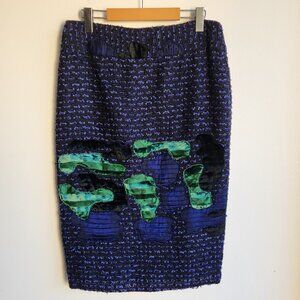 Runway piece from Oscar de la Renta’s Fall 2010 collection, one of the last created during his lifetime. Stunning pencil skirt in rich violet-blue tweed with emerald green, cobalt blue, and black silk + velvet appliqués. Identical front and back.