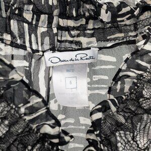 Made in the U.S.A., this peasant-style blouse from Oscar de la Renta's 2010 Autumn and Winter collection is crafted with a black and white abstract-print silk crepe, and is trimmed with tonal lace. It features long sleeves, ruffled snap-closure cuffs, raglan shoulders, a ruffled scoop neck with a self tie, and a relaxed bodice.