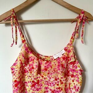 Oscar de la Renta Pink Label Floral Mini Slip Dress Pink Ruffle Coquette Fairy Feminine Romantic Large. Vintage Y2K style mini slip dress. Tie sleeve detail. Ruffle front neckline. Pretty pink ditsy floral rose print. Size large. Excellent condition.