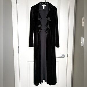 Elegant and timeless Oscar de la Renta Pink Label black velvet duster/robe with dramatic ruffle trim and a self-tie waist. This piece drapes beautifully and can be styled as a luxe lounge robe, evening layer, or statement duster over dresses and slip silhouettes.