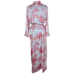 Experience luxury with the Oscar de la Renta Pink Label floral robe. This elegant piece features a beautiful blue base adorned with pink floral patterns, perfect for adding a touch of sophistication to your bodoir collection.