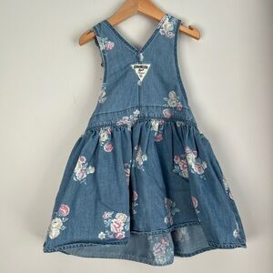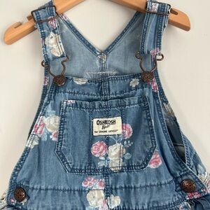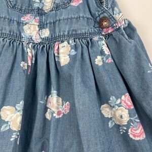 Oshkosh B’gosh Skirtall. Denim overalls dress that is a lighter blue with a delicate all over floral print. Adjustable straps.