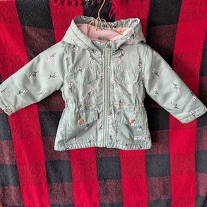 Adorable olive green fleece lined coat with floral design. Warm and stylish for outdoor fun.