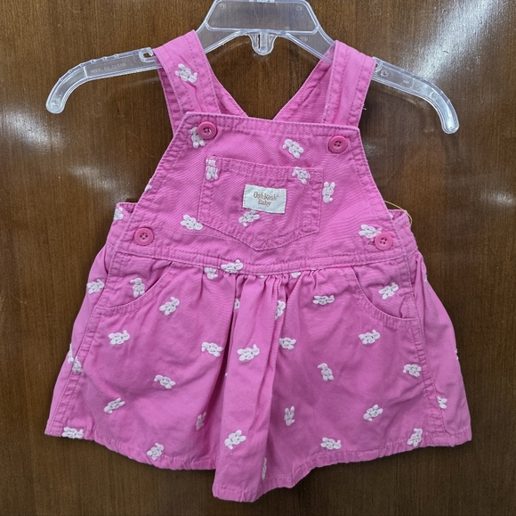 Adorable pink dress overalls with cute bunny prints. Perfect for playful days. Made by OshKosh B'gosh.